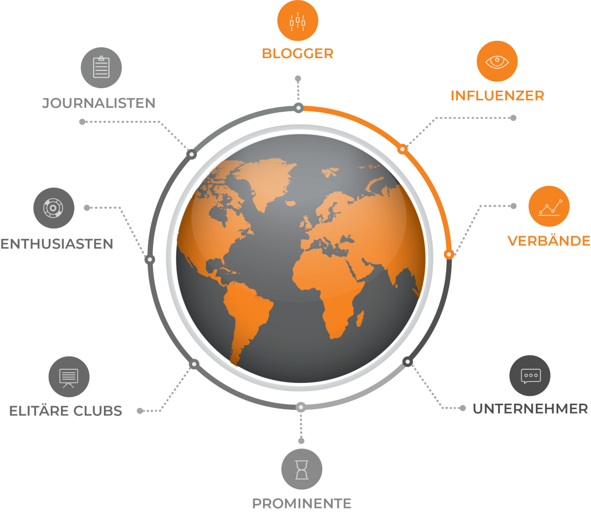Weltweit einzigartiges Netzwerk aus über 100.000 elitären, gut situierten Liebhabern, Sammlern und Enthusiasten im Bereich Luxus Automobile, Yachten und Immobilien. Mit über 10.000 Journalisten, Bloggern und Influenzern im Premium und Lifestyle Bereich. Mit über 1200 Luxus und Lifestyle Online Blogs, Magazinen und Social-Media-Kanälen. Produktbezogenes Netzwerk aus über 5000 deutschsprachigen Maklern, 50000 internationalen Maklern, 23500 internationalen Premium Fahrzeug Händlern und 250 internationalen Yacht Händlern.